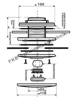 Aus ABS weiß, mit Gewindehülsen für die Flanschbefestigung. Anschluss 2“ Außengewinde, Ø50 mm innen. Komplett mit Flansch, Dichtungen und Schrauben. Zur Installation in Wanddurchführung 15663. Gitterschlitzbreite < 8 mm. (optional Kugel und Blende aus V4A)