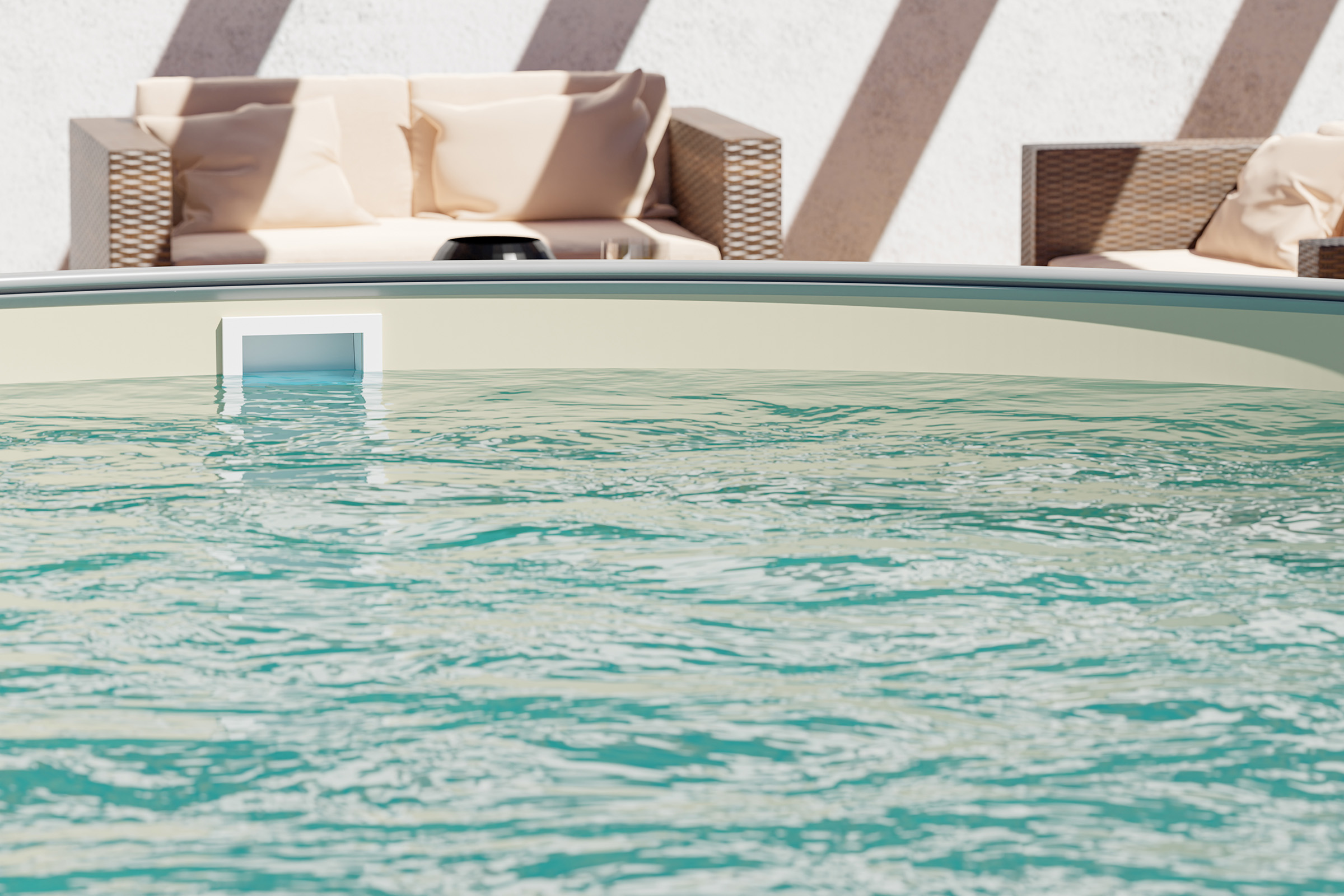 Die Beckenwand besteht aus einem hochwertigen, feuerverzinkten Stahlmantel, außen mit weißem Kunststoff beschichtet und innen mit Schutzlack versehen. An den Enden wird die Stahlwand mittels Aluminium-Steckprofil verbunden, wodurch eine stabile und einfach lösbare Verbindung entsteht.