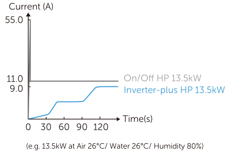 Wenn die Pool-Wärmepumpe InverX eingeschaltet wird, beginnt der Strom bei 0A und steigt in 2 Minuten langsam auf den Nennstrom an. Das Hausstromsystem wird nicht beeinträchtigt, während der häufige Anlaufstrom der Ein/Aus-Wärmepumpe das Fünffache des Nennstroms beträgt, ist dies eine Belastung für das Stromnetz.